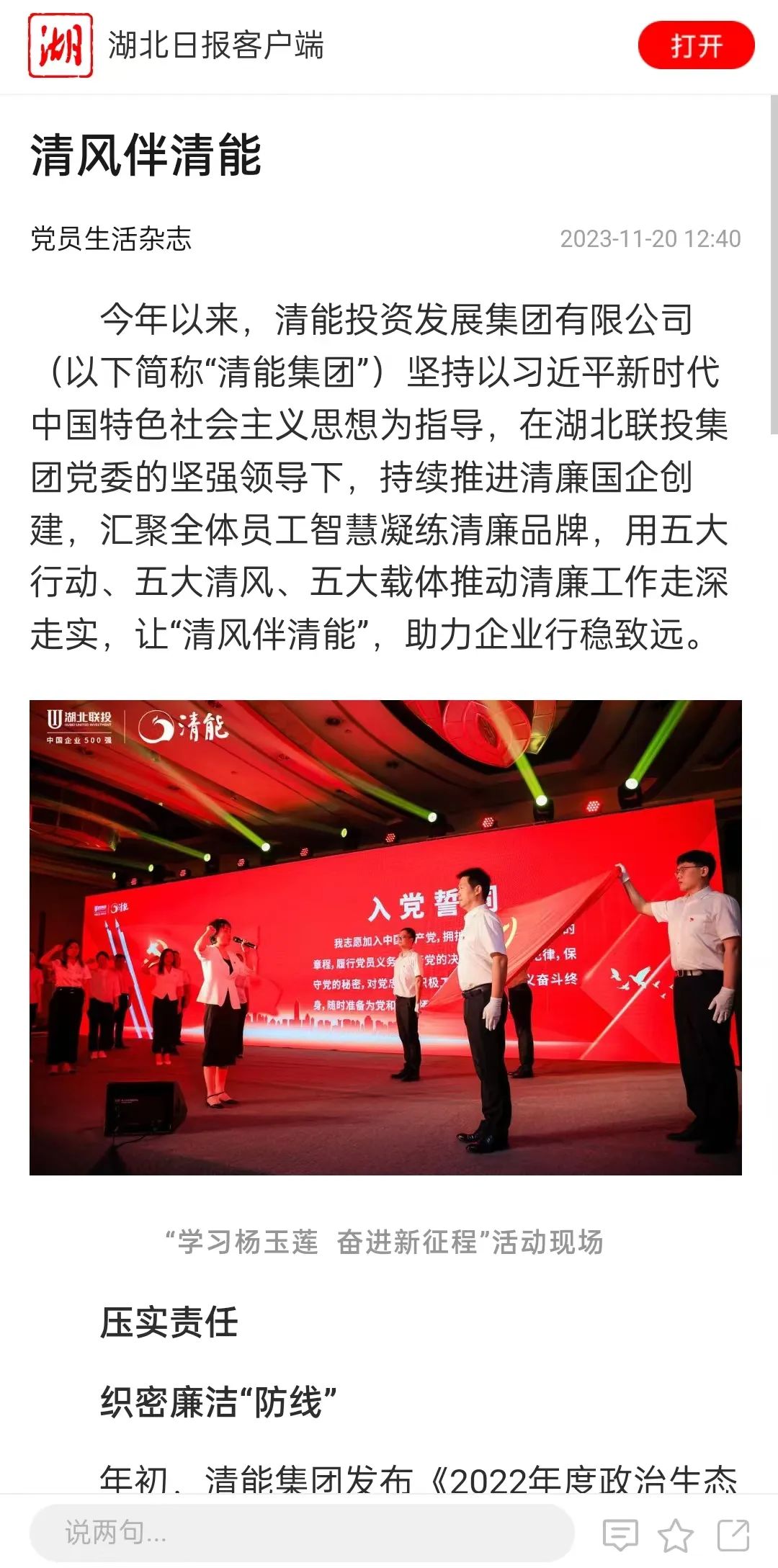 湖北日報關注聯投·清能集團“清風伴清能”廉潔品牌建設