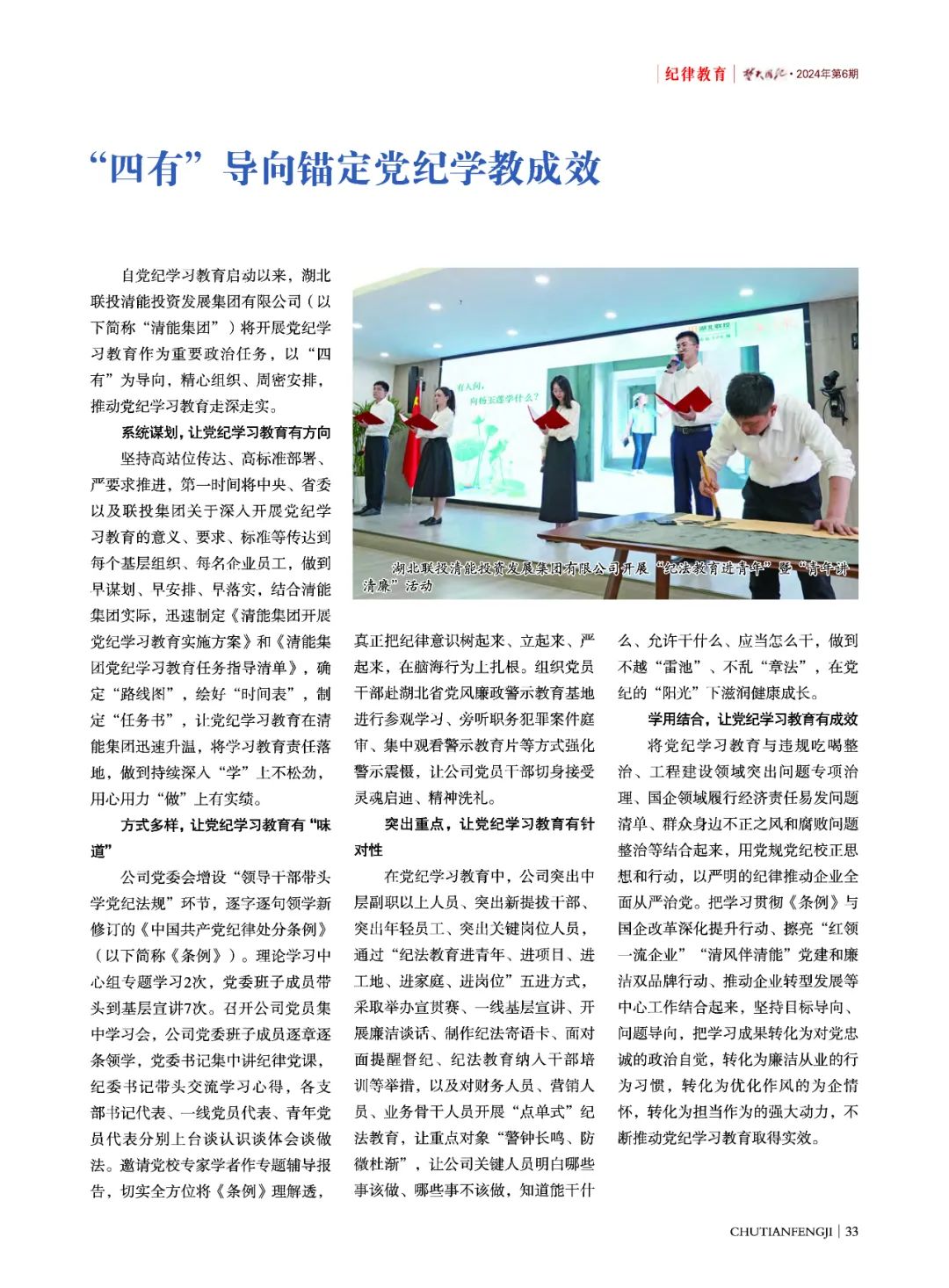 由中共湖北省紀律檢查委員會、湖北省監察委員會主辦的《楚天風紀》在今年6月報道清能集團紀律教育開展情況,標題為《“四有”導向錨定黨紀學教成效》。全文報道如下: